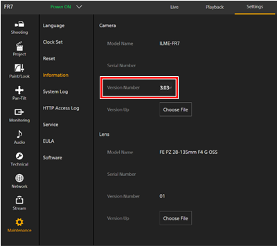 - 웹 브라우저에서 카메라에 액세스하여 펌웨어를 업데이트합니다. 자세한 내용은 ILME-FR7 도움말 가이드를 참조하십시오.